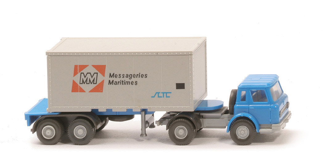 | Zugmaschine | Kabine | himmelblau | Lüfter | mit | Inneneinrichtung | silbergrau | Verglasung | klar | Chassis | silbergrau | Radlauf hinten | anthrazit | Sattelpfanne | für großen Königsbolzen | Reserverad | hinter Kabine | Räder | Profil grob | Felgen | silbergrau | | Container | Art | 20 ft Glattwand | Farbe | achatgrau | Türen | alt | Beschriftung | Messageries Maritimes (s. Foto) | Beschriftung Art | Druck orange/schwarz/blau | | Auflieger | Farbe | himmelblau | Variante | ohne Markierung, mit Bohrungen neben KoBo | Reserverad | unter Auflieger, gesteckt | Bodenprägung | 52h | Doppelachsaggregat Farbe | basaltgrau | Doppelachsaggregat Typ | Klemmplatte WIKING u. GERMANY | Hydraulikstützen | silbern, gesteckt | Räder | Profil grob | Felgen | silbergrau |