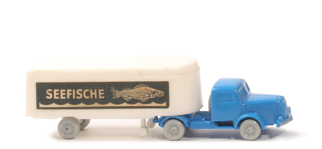 Achsen | Rollachser | | Zugmaschine | Farbe Kabine | himmelblau | Farbe Chassis | himmelblau | Bemalung | Scheinwerfer, Stoßstange | Sattelpfanne | eingesetzt, in Chassisfarbe | Chassis | Version 1a | Achshalterungen | geschlossen | Bodenprägung | WM (ohne Kreis) | Reserverad | hinter Kabine | Räder | sog. Porzellanräder | | Auflieger | Farbe Oberteil | glasiges weiß | Farbe Unterteil | glasiges weiß | Radlauf | ohne Kotflügel | Bodenprägung | WM im Kreis | Rückleuchten | ohne | Dach | glänzend | Aufkleberart | Papier, matt | Beschriftung | Seefische blau/weiß (s. Foto) | Art Beschriftung | Papieraufkleber | Räder | sog. Porzellanräder |