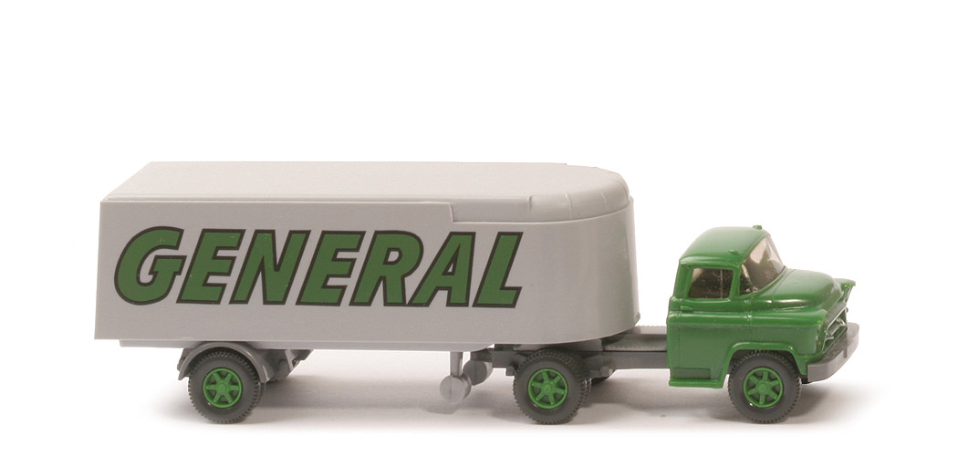 | Zugmaschine | Farbe Kabine | "grasgrün" | Farbe Chassis | ca. staubgrau | Sattelpfanne | alt, mit Steg, für großen KöBo, ähnlich | Zughaken | mit | Bodenprägung | neues WIKING-Logo, Germany | Räder Typ | 11 mm, 2-teilg | Felgen | Trilex, "grasgrün" | | Auflieger | Farbe Oberteil | silbergau | Farbe Unterteil | silbergrau | Radlauf | mit Kotflügel, ca. staubgrau | Bodenprägung | neues WIKING-Logo | Königsbolzen | stark | Rückleuchten | mit | Dach | mattiert | Bedruckung | "General" (s. Foto) | Räder Typ | 11 mm, 2-teilg | Felgen | Trilex, "grasgrün" |