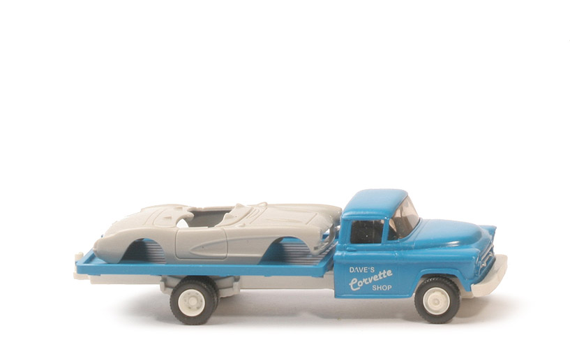 | Kabine | ca. himmelblau | | Verglasung | leicht getönt | | Türdruck | "Daves Corvette Shop" | | Bedruckung Front | Scheinwerfer, Zierlinien silber | | Chassis | weiß | | Chassis vor Hinterachse | geschlossen | | Bodenprägung | WM, neues WIKING-Logo | | Pritsche | ca. himmelblau | | Bemalung Rückleuchten | ohne | | Räder | 9 mm, 2-teilig | | Felgen | weiß | | Ladung | Chevrolet Corvette Karosserie, lichtgrau |