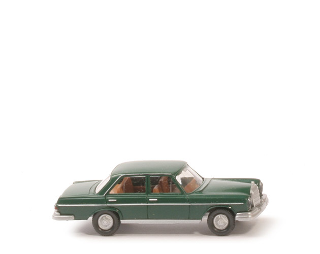 | Farbe Karosserie | "moosgrün" | | Scheinwerfer | klar, eingeklebt | | Fläche hinter Scheinwerfern | nicht bemalt | | Grill | silbern lackiert, eingesetzt, mit Stern | | Inneneinrichtung | "orangebraun" | | Lenkrad | integriert | | Chassis Farbe | silbern lackiert | | Bodenprägung | Mercedes 280 S, WIKING Germany, 154 | | Bemalung Rückleuchten | rot | | Räder | Riffelkappe gesilbert |