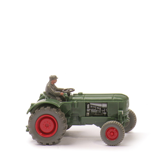 | Aufbau | diamantgrün, Version 1 | | Vorderachsportal | diamantgrün | | Unterbau | diamantgrün | | BP hinter Vorderachse | Germany | | Fahrersitz | diamantgrün | | Scheinwerfer | klein (ca. 2 mm), silbern bemalt | | Motorblock | silbern eingesetzt | | Lenkrad Typ | ca. anthrazit, 4-speichig | | Lenkrad Position | waagerecht | | Fahrer | ca. basaltgrau | | Zughaken | groß | | Rückleuchten | unbemalt | | Kamin | ohne | | Dachhalterungen auf Kotflügel | ohne | | Dach | ohne | | Vorderräder | 11 mm, ca. basaltgrau, Profil grob | | Felgen vorne | 6-Loch, rot | | Hinterräder | 17 mm, ca. basaltgrau | | Felgen hinten | rot |