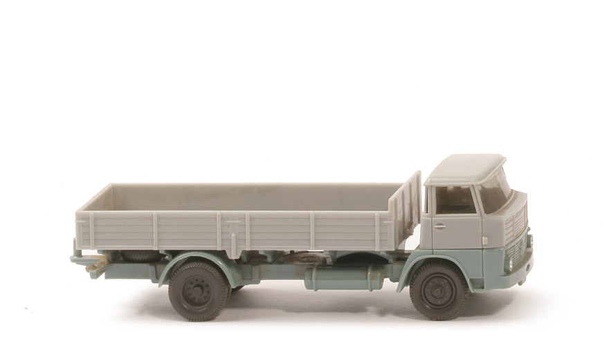 Kabine oben | silbergrau | Kabine unten | grünblau | Verglasung | getönt | Chassis Farbe | grünblau | Chassis Typ | Typ 1b - a | Pritschen-Halterung | grünblau | Pritsche | neu, silbergrau | Pritscheneinlage | silber | Reserverad | hinten | Zughaken | einfach | Bemalung | Scheinwerfer | Räder | 12-Loch anthrazit |