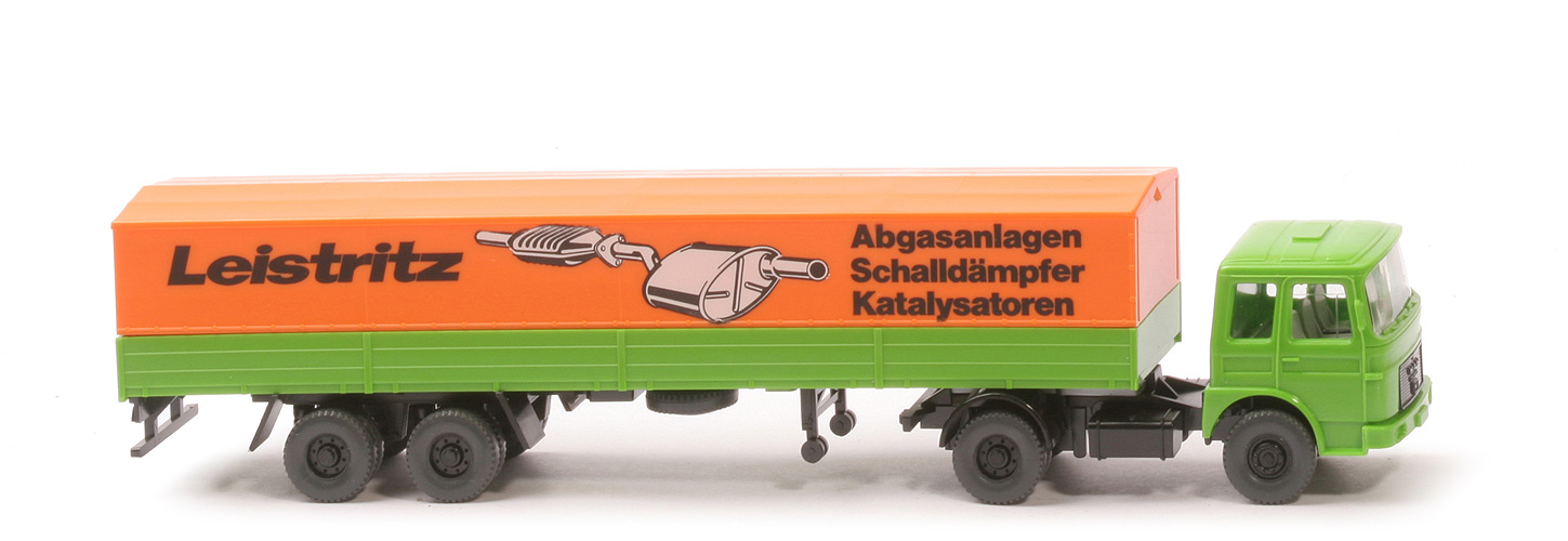 | Zugmaschine | Fahrerhaus | gelbgrün | Verglasung | klar | Inneneinrichtung | ca. lichtgrau, 3 Sitze mit Lenkrad | Spiegel | mit | Scheibenwischer | mit | Lüftergitter | ohne | Grill | silbern, mit Löwe | Motorblock | schwarz | Chassis | schwarz, neu | | Auflieger | Art | 4-fach-Teilung | Farbe Pritsche | gelbgrün | Pritsche Bodenprägung | Wiking, Berlin-W | Chassis | schwarz | Pritscheneinlage | Pappe, silbern | Plane | rotorange | Druck | "Leistritz", ... (s. Foto) | Stützen | als Rollen, eingesetzt | Doppelachsaggregat | schwarz | Doppelachsaggegat Typ | Version 4b, Kotflügel eckig | Heck | gerade | Warndreiecke | neben Rückleuchten | Räder | 12mm, Profil grob | Felgen | 8-Loch, schwarz |