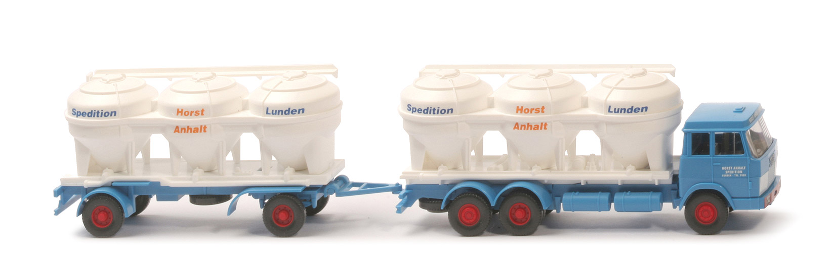 | Zugwagen | Kabine oben | lichtblau | Kabine unten | lichtblau, Stoßstange weinrot bedruckt | Verglasung | klar | Inneneinrichtung | ca. platingrau, Lkr integriert | Chassis Farbe | lichtblau | Chassis Bodenprägung | neues WIKING-Logo, Germany | Zughaken | Mini-Ausführung | Radlauf hinten | 2-teilig, lichtblau | Unterbau Silo | weiß | Siloaufbau | weiß | Galerie, Leiter | weiß | Räder | schwarz, Profil grob | Felgen | 8-Loch, rot | | Anhänger | Chassis | lichtblau | Achshalterungen | lichtblau | Unterfahrschutz | mit | Unterbau Silo | weiß | Siloaufbau | weiß | Galerie, Leiter | weiß | Räder | schwarz, Profil grob | Felgen | 8-Loch, rot | | Beschriftungen | Bedruckung Front | Horst Anhalt Lunden, Kabine unten flächig weiß | Bedruckung Grill | Hanomag-Henschel silbern, Stege weiß | Bedruckung Türen | Horst Anhalt Spedition ... | Silo | Horst Anhalt, Spedition Lunden |