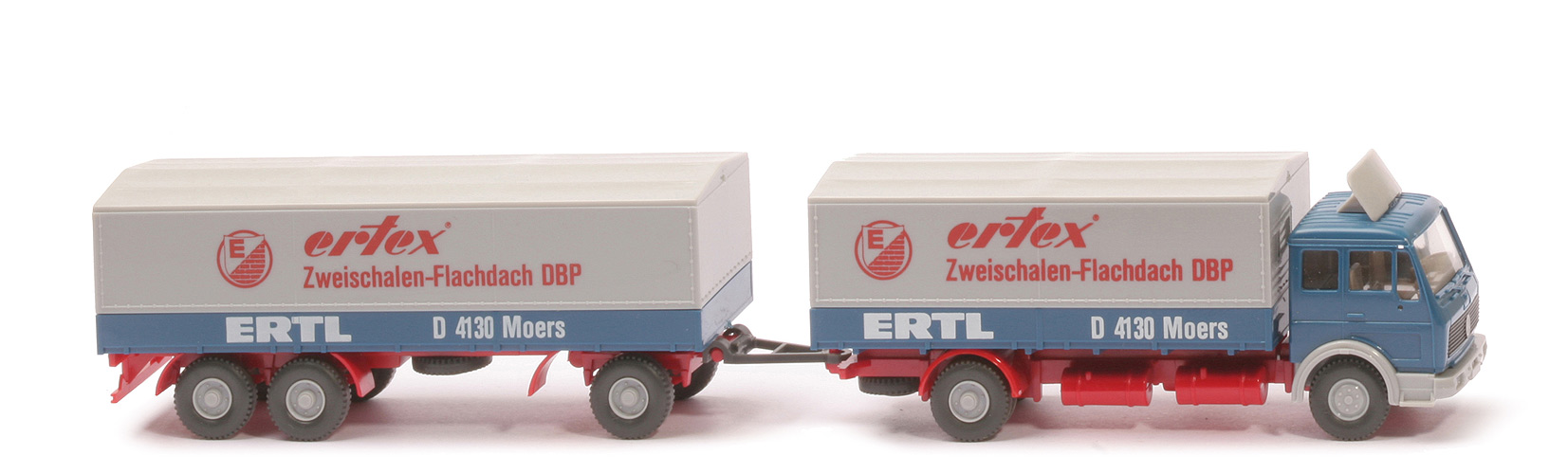 | | Zugwagen | | Kabine | capriblau | | eingesetzter Grill | schwarz, ohne Streifen | | Spoiler | silbergrau | | Heckfenster | geschlossen | | Spiegelaufnahmen | mit | | Inneneinrichtung | ca. hellolivgrau | | Stoßstange | silbergrau | | Chassis | rot | | Radlauf hinten | rot | | Reserverad | hinten unter Chassis | | Pritsche | capriblau | | Pritscheneinlage | Pappe, silbern | | Plane | silbergrau | | Beschriftung Plane | Ertex ... in rot (s. Foto) | | Beschriftung Pritsche | Ertl, D 4130 Moers | | Räder | Profil grob | | Felgen | silbergrau, 6-Loch | | | Anhänger | | Pritsche | capriblau | | Chassis | rot | | Drehschemel | rot | | Doppelachsaggregat | rot | | Pritscheneinlage | Pappe, silbern | | Plane | silbergrau | | Beschriftung Plane | Ertex ... in rot (s. Foto) | | Beschriftung Pritsche | Ertl, D 4130 Moers | | Räder | Profil grob | | Felgen | silbergrau, 6-Loch | | | Link | | zum Serienmodell | Ertex blau |