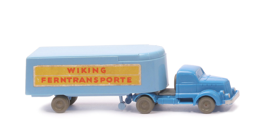 Achsen | Rollachser | | Zugmaschine | Farbe Kabine | himmelblau | Farbe Chassis | himmelblau | Bemalung | Scheinwerfer, Stoßstange | Sattelpfanne | eingesetzt, in Chassisfarbe | Chassis | Version 1b | Achshalterungen | geschlossen | Bodenprägung | WM (ohne Kreis) | Reserverad | hinter Kabine | Räder | 11mm Profil, ca. basaltgrau | | Auflieger | Farbe Oberteil | lilablau | Farbe Unterteil | lilablau | Radlauf | ohne Kotflügel | Bodenprägung | WM im Kreis | Rückleuchten | ohne | Dach | glänzend | Aufkleberart | Papier, matt | Beschriftung | Ferntransporte (s. Foto) | Beschriftung Farbe | gelb mit roter Schrift | Räder | 11mm Profil, ca. basaltgrau |