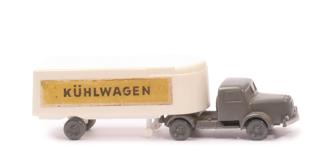 Achsen | Rollachser | | Zugmaschine | Farbe Kabine | basaltgrau | Farbe Chassis | basaltgrau | Bemalung | Stoßstange, Scheinwerfer silbern | Sattelpfanne | eingesetzt, in Chassisfarbe | Chassis | Version 1a | Achshalterungen | geschlossen | Bodenprägung | WM im Kreis | Reserverad | hinter Kabine | Räder | 11mm, ohne Profil, dunkelbasaltgrau | | Auflieger | Farbe Oberteil | weiß | Farbe Unterteil | weiß | Radlauf | ohne Kotflügel | Bodenprägung | WM im Kreis | Rückleuchten | ohne | Dach | glänzend | Aufkleberart | Papier, matt | Beschriftung | Kühlwagen (s. Foto) | Beschriftung Farbe | gelb mit schwarzer Schrift | Räder | 11mm, ohne Profil, dunkelbasaltgrau |
