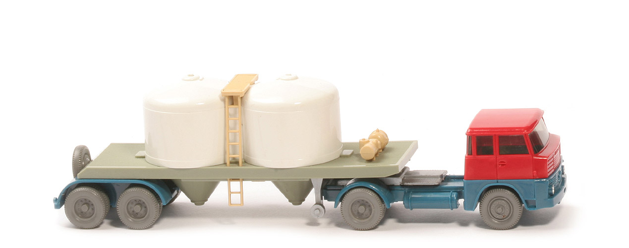 | Zugmaschine | Kabine oben | rot | Kabine unten | azurblau | Verglasung | getönt | Stege für Inneneinrichtung | nein | Chassistyp | alt | Chassisfarbe | azurblau | Zughaken/Stoßstange | abgetrennt | Fläche hinter Sattelpfanne | geriffelt | Tank (Beifahrerseite) | von unten noch ohne Aussparung (Serie: mit) | Bodenprägung | noch ohne WM (Serie: mit) | Sattelpfanne | alt, mit Steg, für kleinen KöBo | Reserverad | ohne | Räder | 12 mm, 10 Loch, hellgrau | | Auflieger | Tanks | weiß | Basis | hellgraugrün | Leitern Pumpeinheit | hellbeige | Achseinheit | azurblau (nur bei Vorserien bekannt) | Typ Achseinheit | Made in Germany, Schlitze | Königsbolzen | dünn, eckig, eingeklebt | Stütze | silber | Beschriftung | ohne | Räder | 12 mm, 10 Loch, hellgrau |
