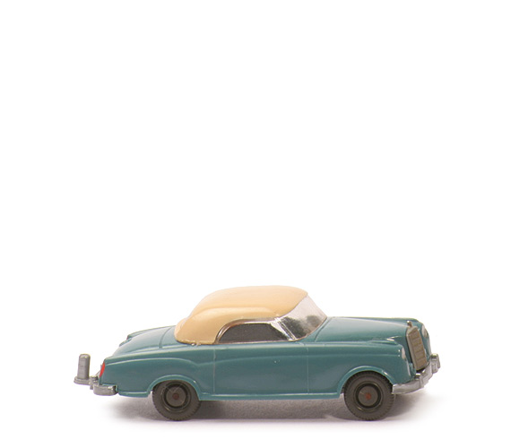 Farbe Karosserie | diamantblau | Verglasung | klar | Grill | separat eingeklebt | Stern | mit | Verdeck | hellbeige | Chassis Farbe | silbern | Bodenprägung | WM | hinteres Kennzeichen | Teil des Chassis | Zughaken | angeklebt | Bemalung Hauptscheinwerfer | silbern | Bemalung Nebelscheinwerfer | ohne | Bemalung Zierlinie Blinker | ohne | Bemalung Rückleuchten | rot | Räder | Nabe flach, anthrazit |