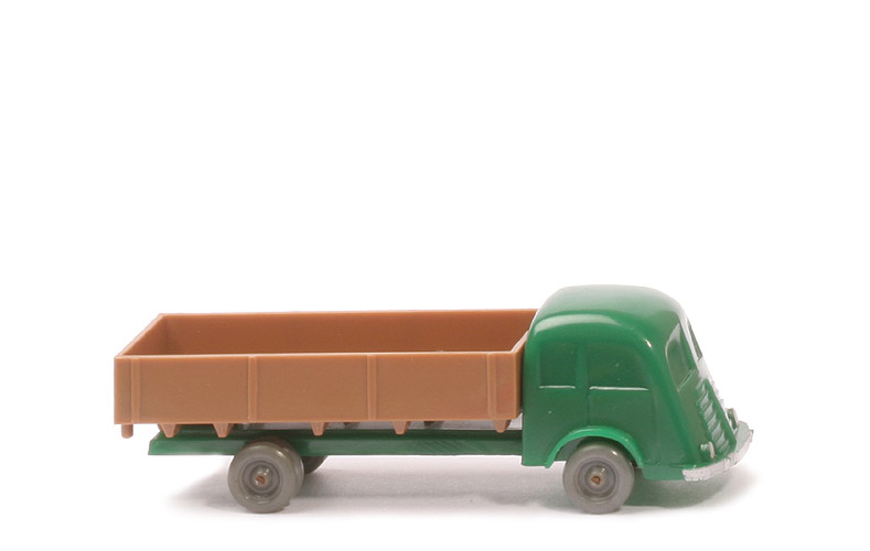 Achsen | Drahtachser | Farbe Kabine u. Chassis | dunkelgrün | Bemalung Scheinwerfer | silbern | Bemalung Nummernschild | silbern | Bemalung Stoßstange | silbern | Version Chassis | mit Schlitz | Bodenprägung | WM | Pritsche Typ | hoch | Pritsche Farbe | ockerbraun | Zapfen | mit Rundzapfen | Pritschenfläche | mit Struktur | Bemalung Nummernschild hinten | ohne | Zughaken | in Pritsche integriert, nach unten | Räder | 9 mm, ohne Profil | Farbe Räder | glasiges grau |