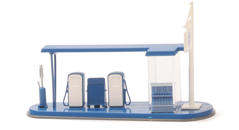 PMS-Modell. Im Beipack gibt es 4 Pkw-Räder mit Alufelgen, zwei Tankwarte und 2 Tonnen in ca. maritimblau. Es liegt ein Bogen zur Beschriftung in Form von selbstklebenden Papieraufklebern bei. Hierbei sind sage und schreibe 48 Aufkleber ausgestanzt! Das Modell ist ohne historisches WIKING-Vorbild. Die vormals vorhandene Stele bei der SHELL-Tankstelle ist hier durch eine stilisierte Fahne ersetzt. Das Modell war bald vergriffen. |