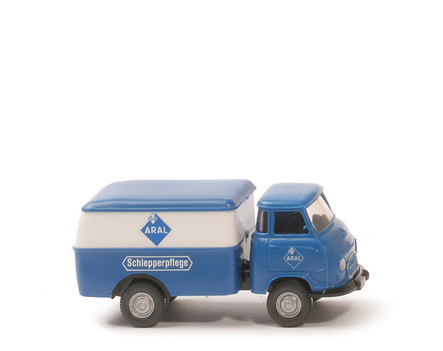 | Kabine | "verkehrsblau" | | Verglasung | klar | | Bedruckung Scheinwerfer | silber | | Bedruckung Grill | Umrandung, Schriftzug silber | | Bedruckung Türen | ARAL Emblem | | Inneneinrichtung | ohne | | Chassis | schwarz | | Bodenprägung | Wiking Germany (alt!) | | Kofferdach | "verkehrsblau" | | Koffer oben | weiß | | Koffer unten | "verkehrsblau" | | Bedruckung Rückleuchten | ohne | | Bedruckung Kennzeichen hinten | ohne | | Bedruckung Koffer oben | ARAL Emblem | | Bedruckung Koffer unten | Schlepperpflege | | Räder | 9mm, Felgen silbern eingesetzt | | Ladegut | ohne |