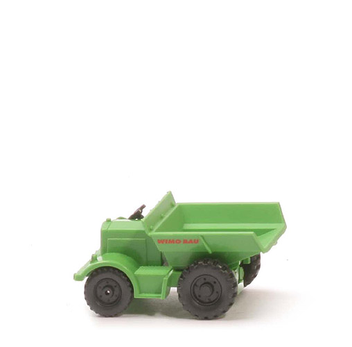 Farbe Karosserie | gelbgrün | Ausführung Motorabdeckung | 2 Nippel | Bodenprägung | neues WIKING-Logo, 657 | Farbe Mulde | gelbgrün | Silberung Mulde | ohne | Lenkrad Farbe | schwarz | Fahrer | ohne | Räder Farbe | schwarz | Räder Typ vorne | 12mm einzeilig, Profil sehr grob | Räder Typ hinten | 10mm, Profil grob, 6-Loch | Bemalung Rückleuchten | rot | Beschriftung | Wimo Bau | Beschriftung Art | Druck rot auf Mulde |