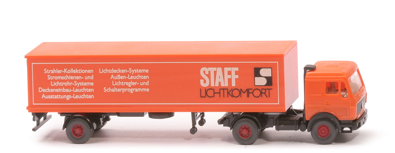 | Zugmaschine | Kabine Farbe | orange | hintere Seitenfenster | geschlossen | Scheibenwischer | mit | Heckfenster | geschlossen | eingesetzter Grill | schwarz, mit MB-Stern, ohne Streifen | Inneneinrichtung | ca. graubeige, Lenkrad integriert | Ansaugstutzen | schwarz, hinter Kabinenrückwand | Stoßstange | schwarz | Chassis | schwarz, BP WIKING | Radlauf hinten | schwarz | Reserverad | ohne | Räder | 12 mm, Profil grob | Felgen | 8-Loch, hellbraunrot | | Auflieger | Koffer Korpus | orange | Dach | orange | Türen | orange | Beschriftung | Staff (s. Foto) | Beschriftung Art | Druck weiß und schwarz | Chassis | schwarz | Bodenprägung | WIKING Berlin-W | Unterfahrschutz | mit | Einachsaggregat | schwarz, eingesteckt | Hydraulikstütze | schwarz, mit Rollen | Räder | 12 mm, Profil grob | Felgen | 8-Loch, hellbraunrot |