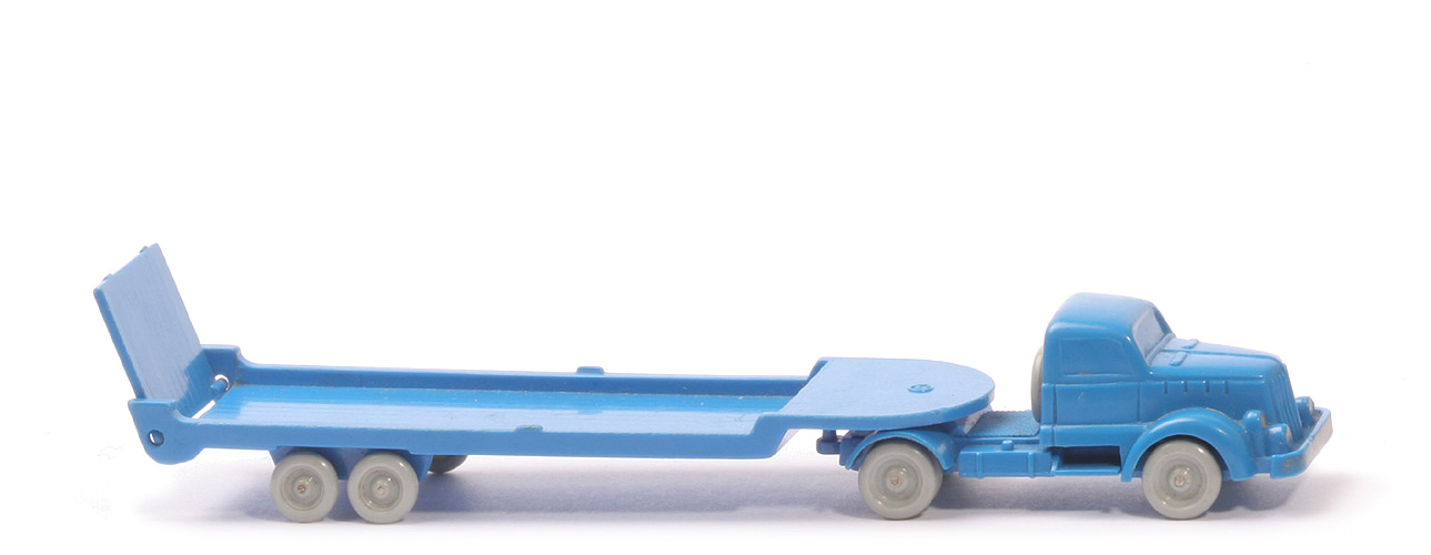 Achsen | Rollachser | | Zugmaschine | Farbe Kabine | himmelblau | Farbe Chassis | himmelblau | Bemalung | Scheinwerfer, Kennzeichen silbern | Sattelpfanne | eingesetzt, in Chassisfarbe | Chassis | Version 1b | Achshalterungen | geschlossen | Bodenprägung | WM im Kreis | Reserverad | hinter Kabine | Räder | sog. Porzellanräder | | Auflieger | Achsen | Rollachser | Farbe | himmelblau | Typ | vorn rund (Typ 1) | Seilwinde | ohne | Fläche über Drehschemel | mit Prägung WM im Kreis | Rückleuchten | ohne | Rampe | kurz | Stützen | ohne | Bodenprägung | ohne | Königsbolzen | kurz | Räder | sog. Porzellanräder |