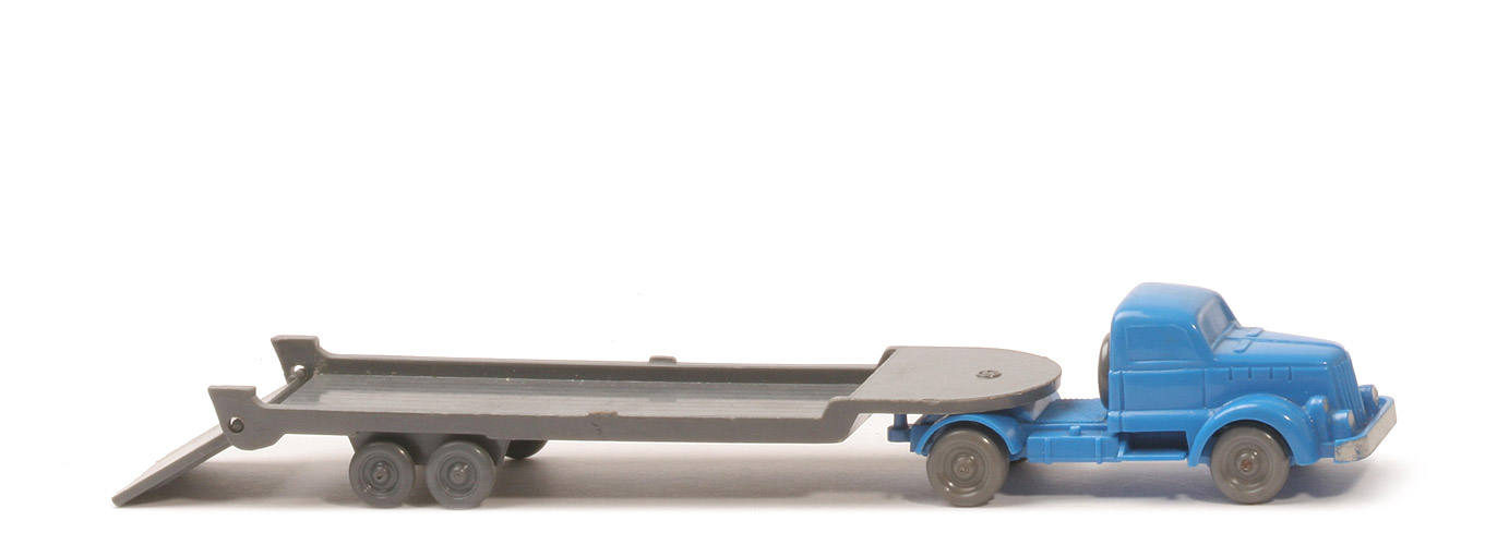 Achsen | Rollachser | | Zugmaschine | Farbe Kabine | himmelblau | Farbe Chassis | himmelblau | Bemalung | Scheinwerfer, Kennzeichen silbern | Sattelpfanne | eingesetzt, in Chassisfarbe | Chassis | Version 1b | Achshalterungen | geschlossen | Bodenprägung | WM (im Kreis) | Reserverad | hinter Kabine | Räder | 10 mm, ohne Profil, basaltgrau | | Auflieger | Achsen | Rollachser | Farbe | dunkelbasaltgrau | Typ | vorn rund (Typ 1) | Seilwinde | ohne | Fläche über Drehschemel | mit Prägung WM im Kreis | Rückleuchten | ohne | Rampe | kurz | Stützen | ohne | Bodenprägung | ohne | Königsbolzen | kurz | Räder | ohne Profil, dunkelbasaltgrau |