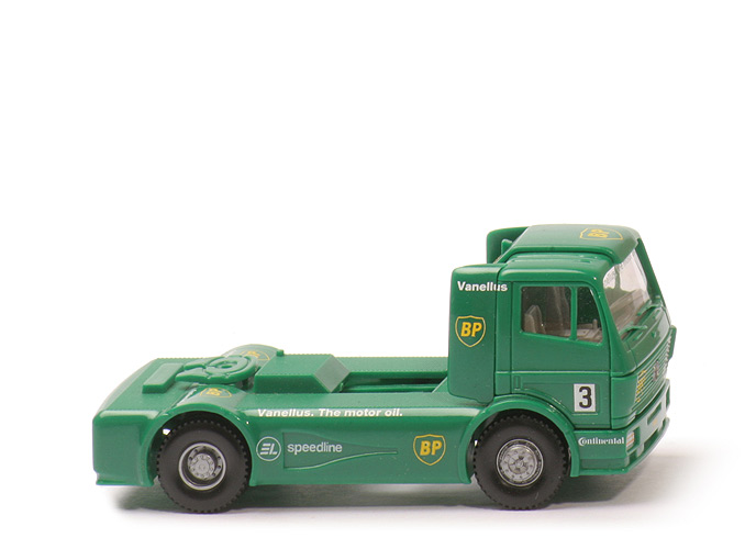 Dies ist der BP-Truck für das Daimler-Benz-Museum. Markant: Chassis grün statt schwarz, Startnummer 3, Trittflächen nicht gesilbert, Heck nicht schwarz sondern detailliert bedruckt. Seiten zusätzlich mit "speedline". |