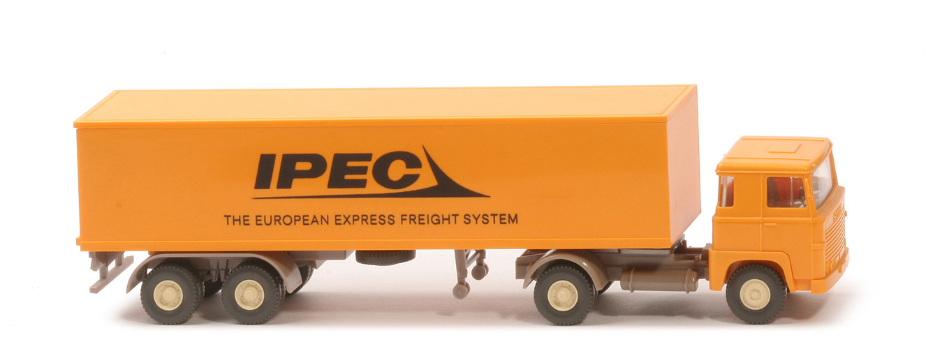| | Zugmaschine | | Dach | melonengelb | | Kabine oben | melonengelb | | Kabine unten | melonengelb | | Stoßstange | melonengelb | | Frontbeschriftung | SCANIA geprägt | | Grill Prägung | mit 111 | | Scheinwerfer | an der Kabine, ungesilbert | | Spiegel | mit | | Scheibenwischer | mit | | Inneneinrichtung | hellgraubeige, mit Lenkrad | | Sattelpfanne | für großen Königsbolzen | | Reserverad | unter Chassis | | Chassis Farbe | hellgraubeige | | Rücklichtstangen | ohne | | Räder | 12mm, Profil grob | | Felgen | 8-Loch, creme | | | Auflieger | | Koffer Korpus | melonengelb | | Dach | melonengelb | | Türen | melonengelb | | Beschriftung Fahrerseite | IPEC, Pfeil nach vorne | | Beschriftung Beifahrerseite | IPEC, Pfeil nach hinten | | Beschriftung Art | Druck schwarz | | Chassis | hellgraubeige, BP WIKING, Berlin-W | | Doppelachsaggregat | Typ 4a, hellgraubeige | | Unterfahrschutz | mit | | Hydraulikstütze | hellgraubeige | | Räder | 12mm, Profil grob | | Felgen | 8-Loch, creme |