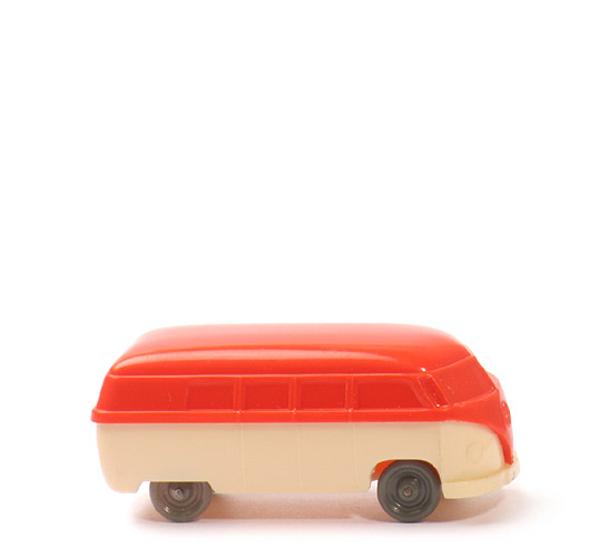 Achsen | Rollachser | Karosserie oben | orange | Seite | mit 4 Seitenfenstern | Front | VW Emblem | Karosserie unten | cremeweiß | Bodenprägung | nur WM (im Kreis) | Bemalung Scheinwerfer | ohne | Bemalung Stoßstange vorne | ohne | Bemalung Heck | ohne | Räder Typ | 8 mm, ohne Profil | Räder Farbe | glasig betongrau |