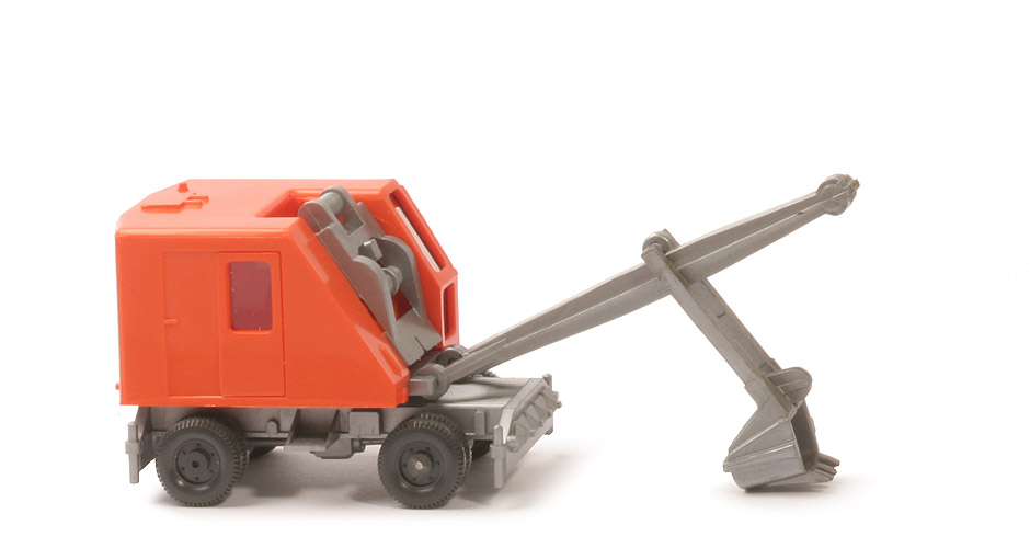 Für das Bild zusammengestecktes Modell. Dieses Modell gab es nur unmontiert in dem Pola-Bausatz "Abbruchhaus". Dort allerdings als Mobilkran. Hier als Bagger. Eher nicht original sondern Kranausleger gegen Baggeransatz getauscht. |