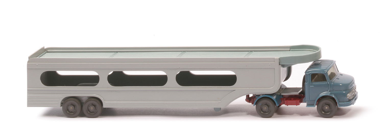 | Zugmaschine | Kabine | mattgraublau | Lüfter | mit | Eckfenster | mit | Blinker | auf Kotflügel | Verglasung | leicht getönt | Inneneinrichtung | ca. lichtgrau | Bemalung | ohne | Farbe Chassis | hellbraunrot | Bodenprägung | Wiking Germany | Radlauf hinten | azurblau | Sattelpfanne | neu, für starken Bolzen | Reserverad | hinter Kabine | Räder | 11 mm, 6-Loch. Profil fein, anthrazit | | Auflieger | Seiten | silbergrau | Mittelsegment | grünblau | Klappe | silbergrau | Platte für Achshalterung | silbergrau | hier Bodenprägung | WM ohne Kreis | weitere Bodenprägung Chassis | WIKING, 58, Germany | Königsbolzen | stark, auf runder Erhebung | hinteres Kennzeichen | unbemalt | Räder | 11 mm, 6-Loch. Profil fein, anthrazit |
