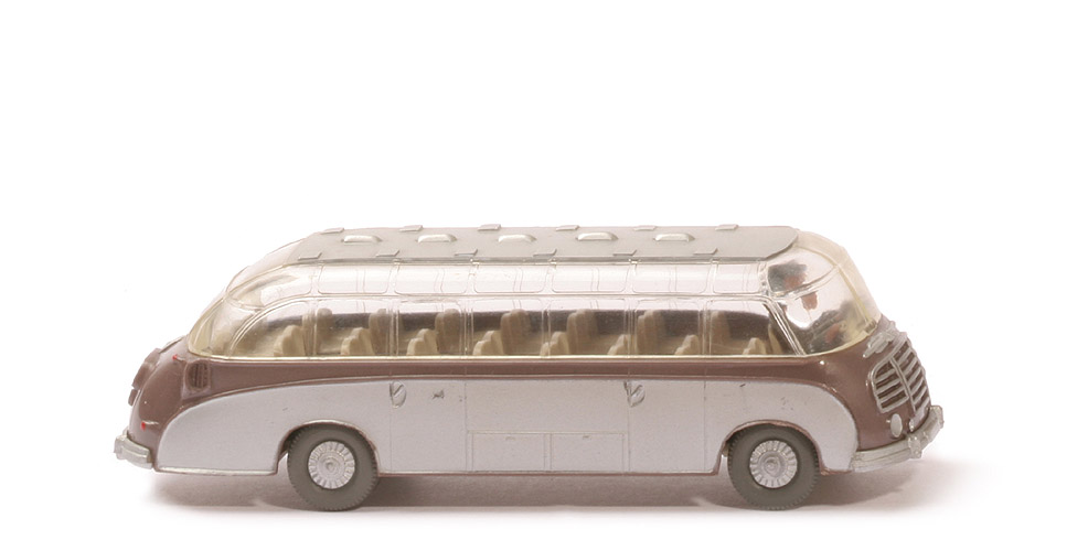 Karosserie Typ | Serie | Karosserie Farbe | braunmetallic | Schlitze für Dach | lang und breit | Armaturenbrett | trapezförmig | Gestaltung Zierline Front | mit Punkt, gesilbert | Boden Fahrgastraum | mit Struktur | Gestaltung Seite | Schablonierung silber | Fahrersitz Farbe | hellgelbgrau | Sitzreihen | hellgelbgrau, gesteckt | Fahrer Typ | groß, mit Mütze | Fahrer Farbe | basaltgrau | Lenkrad Typ | klein, zwei Speichen | Lenkrad Farbe | ca. hellgelbgrau | Dach Befestigung | gesteckt | Dach Gestaltung oben | glatt, Schablonierung silbern | Dach Typ Haltenasen | lang und breit | Chassis Farbe | hellgelbgrau | Chassis Typ | Typ 2 | Achshalterungen hierbei | geschlossen | Bodenprägung hierbei | WM im Kreis | Bemalung Hauptscheinwerfer | silber | Bemalung Nebelscheinwerfer | silber | Bemalung Grill und Zierlinie | silber | Bemalung Stoßstangen | silber | Bemalung Rückleuchten | rot | Bemalung Blinker hinten | rot | Bemalung Kennzeichen hinten | silber | Bemalung 3 Zierlinien hinten | silber | Bemalung Lüfter | ohne | Räder Typ | Trilex Bus, mit Profil | Räder Ausführung | staubgrau, Felgen gesilbert |