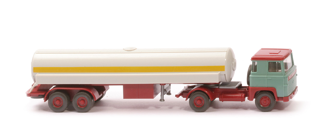 | Zugmaschine | Dach | hellbraunrot | Kabine oben | türkis | Kabine unten | türkis | Stoßstange | hellbraunot | Frontbeschriftung | SCANIA breit | hier Farbhinterlegung | rot | Grill Prägung | mit 110 | Scheinwerfer | in der Stoßstange,gesilbert | Spiegel | ohne | Scheibenwischer | ohne | Lenkrad | ohne | Sattelpfanne | für großen Königsbolzen | Reserverad | ohne | Chassis Farbe | hellbraunrot | Rücklichtstangen | mit | Räder | 12mm, Profil grob | Felgen | hellbraunrot | | Auflieger | Tank | altweiß | Galerie | altweiß | Chassis | hellbraunrot | Achseinheit | hellbraunrot | Stütze | Hydraulikstempel, silber | Reserverad | hinter Achseinheit | Beschriftung Heck | Frigen | Beschriftung Art | Papieraufkleber | gelber Streifen | mit | Räder | 12mm, Profil grob | Felgen | hellbraunrot |