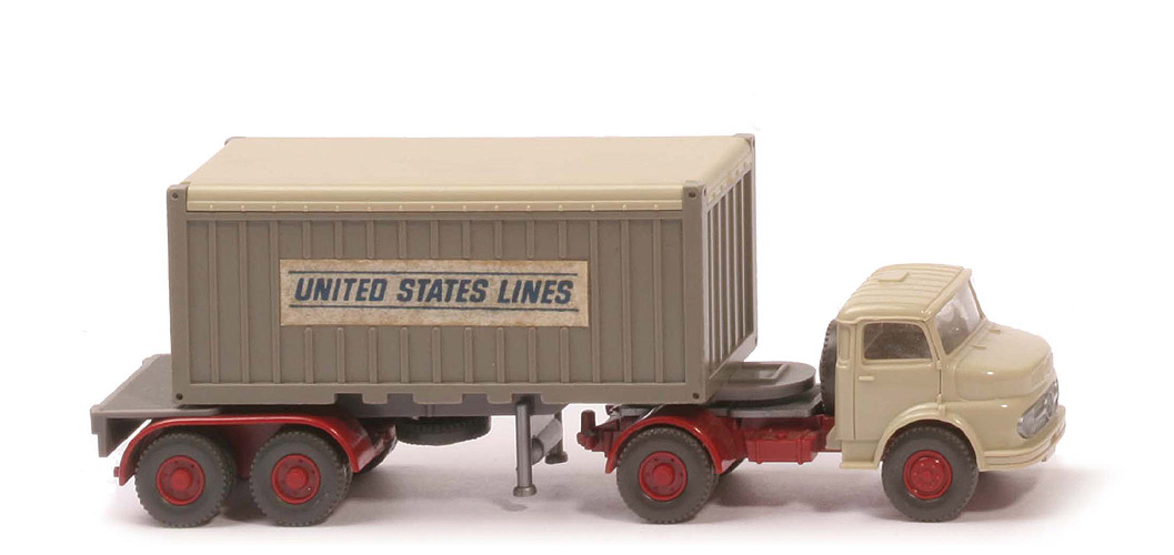 | Zugmaschine | Kabine | hellgelbgrau | Lüfter | mit | Eckfenster | mit | Blinker | auf Kotflügel | Inneneinrichtung | ca. rotelfenbein | Verglasung | klar | Chassis | hellbraunrot | Radlauf hinten | hellbraunrot | Sattelpfanne | für großen Königsbolzen | Reserverad | ohne | Räder | Profil grob | Felgen | hellbraunrot | | Container | Art | Open Top | Dach | hellgelbgrau | Korpus | betongrau | Beschriftung | Unites States Lines ... (s. Foto) | Beschriftung Art | Papieraufkleber | | Auflieger | Farbe | betongrau | Variante | mit Markierung, BP 52 h | DAA Farbe | hellbraunrot | Achshalterung | Klemmplatte | Königsbolzen | stark | Räder | Profil grob | Felgen | hellbraunrot |