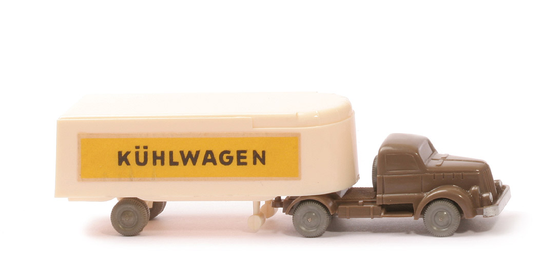 Achsen | Rollachser | | Zugmaschine | Farbe Kabine | blassbraun | Farbe Chassis | blassbraun | Bemalung | Scheinwerfer, Stoßstange | Sattelpfanne | eingesetzt, in Chassisfarbe | Chassis | Version 1b | Achshalterungen | geschlossen | Bodenprägung | WM (ohne Kreis) | Reserverad | hinter Kabine | Räder | 10 mm, mit Profil, staubgrau | | Auflieger | Farbe Oberteil | cremeweiß | Farbe Unterteil | cremeweiß | Radlauf | ohne Kotflügel | Bodenprägung | WM im Kreis | Rückleuchten | ohne | Dach | glänzend | Aufkleberart | Papier, matt | Beschriftung | Kühlwagen (s. Foto) | Beschriftung Farbe | gelb mit blauer Schrift | Räder | 10 mm, mit Profil, staubgrau |