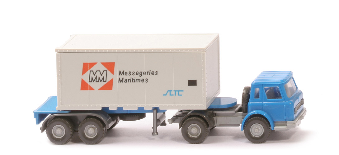 | | Zugmaschine | | Kabine | himmelblau | | Lüfter | mit | | Inneneinrichtung | silbergrau | | Verglasung | klar | | Chassis | silbergrau | | Radlauf hinten | anthrazit | | Sattelpfanne | für großen Königsbolzen | | Reserverad | hinter Kabine | | Räder | Profil grob | | Felgen | silbergrau | | | Container | | Art | 20 ft Glattwand | | Farbe | altweiß | | Türen | alt | | Beschriftung | Messageries Maritimes (s. Foto) | | Beschriftung Art | Druck orange/schwarz/blau | | | Auflieger | | Farbe | himmelblau | | Variante | ohne Markierung, mit Bohrungen neben KoBo | | Reserverad | unter Auflieger, gesteckt | | Bodenprägung | 52h | | Doppelachsaggregat Farbe | basaltgrau | | Doppelachsaggregat Typ | Klemmplatte WIKING u. GERMANY | | Hydraulikstützen | silbern, gesteckt | | Räder | Profil grob | | Felgen | silbergrau |