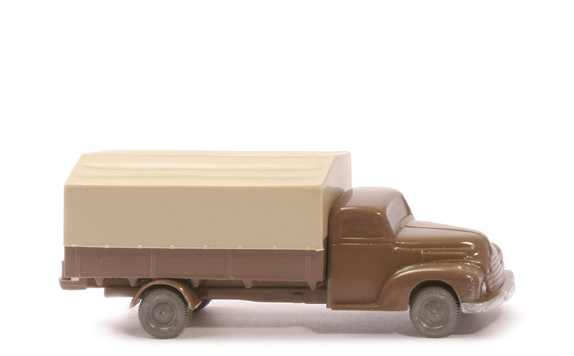 Achsen | Rollachser | Farbe Kabine u. Chassis | blassbraun | Kabinenboden | geschlossen | Bodenplatte Prägung | WM im Kreis | Bemalung Kabine | Scheinwerfer, Stoßstange | Pritsche | Seiten glatt | Farbe Pritsche | blassbraun | Zughaken | nach oben | Zapfen | Flachzapfen | Befestigung Pritsche | geklebt | Plane Typ | geschlossen | Plane Farbe | hellgelbgrau | Räder | 10mm, mit Profil, basaltgrau |