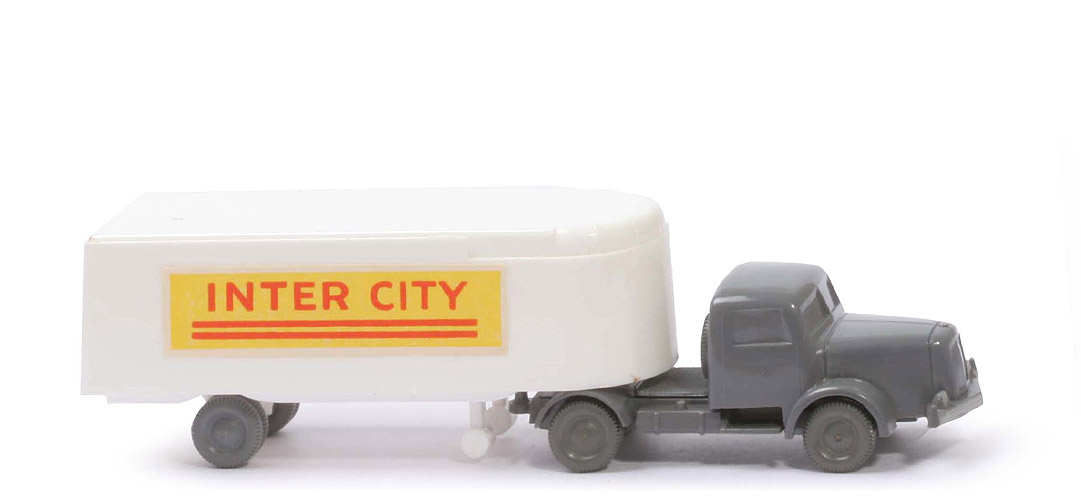 Achsen | Rollachser | | Zugmaschine | Farbe Kabine | basaltgrau | Farbe Chassis | basaltgrau | Bemalung | Scheinwerfer, Stoßstange | Sattelpfanne | eingesetzt, in Chassisfarbe | Chassis | Version 1a | Achshalterungen | geschlossen | Bodenprägung | WM (ohne Kreis) | Reserverad | hinter Kabine | Räder | 10mm, mit Profil, ca. basaltgrau | | Auflieger | Farbe Oberteil | weiß | Farbe Unterteil | weiß | Radlauf | ohne Kotflügel | Bodenprägung | WM im Kreis | Rückleuchten | ohne | Dach | glänzend | Aufkleberart | Papier, matt | Beschriftung | Inter City (s. Foto) | Beschriftung Farbe | gelb mit roter Schrift | Räder | 10mm, mit Profil, ca. basaltgrau |