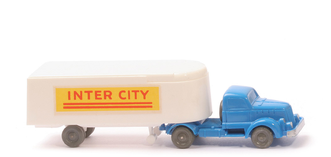 Achsen | Rollachser | | Zugmaschine | Farbe Kabine | himmelblau | Farbe Chassis | himmelblau | Bemalung | Scheinwerfer, Stoßstange | Sattelpfanne | eingesetzt, in Chassisfarbe | Chassis | Version 1a | Achshalterungen | geschlossen | Bodenprägung | WM (ohne Kreis) | Reserverad | hinter Kabine | Räder | 10mm, mit Profil, ca. basaltgrau | | Auflieger | Farbe Oberteil | weiß | Farbe Unterteil | weiß | Radlauf | ohne Kotflügel | Bodenprägung | WM im Kreis | Rückleuchten | ohne | Dach | glänzend | Aufkleberart | Papier, matt | Beschriftung | Inter City (s. Foto) | Beschriftung Farbe | gelb mit roter Schrift | Räder | 10mm, mit Profil, ca. basaltgrau |
