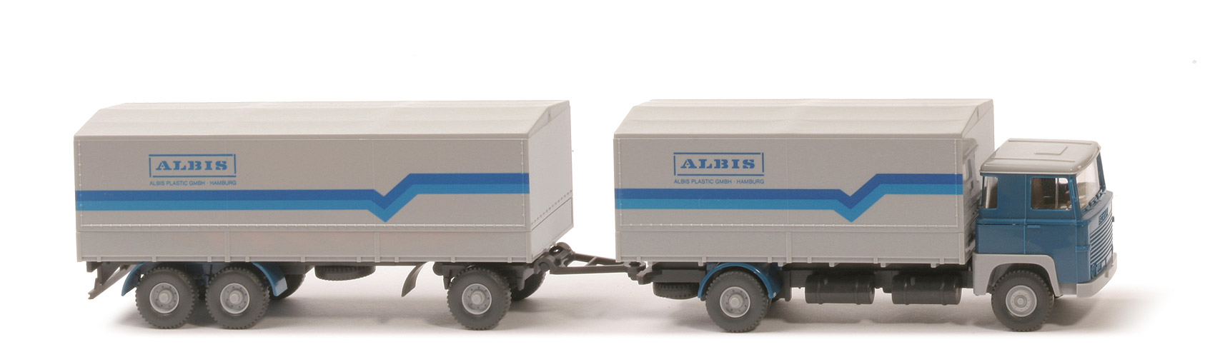 | Zugwagen | Kabinendach | silbergrau | Kabine oben | capriblau | Kabine unten | capriblau | Stoßstange | silbergrau | Frontbeschriftung | SCANIA, geprägt | Scheinwerfer | 2, ungesilbert | Spiegel | mit | Scheibenwischer | mit | Lenkrad | mit | Chassis | dunkelbasaltgrau | Radlauf hinten | capriblau | Pritsche | silbergrau | Pritscheneinlage | Pappe, silbern | Plane | silbergrau | Beschriftung Plane | Albis,... (s. Foto), Druck blau | Räder | 12mm, Profil grob | Felgen | silbergrau, 8-Loch | | Anhänger | Pritsche | silbergrau | Chassis | dunkelbasaltgrau | Drehschemel | dunkelbasaltgrau | Doppelachsaggregat | capriblau | Pritscheneinlage | Pappe, silbern | Plane | silbergrau | Beschriftung Plane | Albis,... (s. Foto), Druck blau | Räder | 12mm, Profil grob | Felgen | silbergrau, 8-Loch |