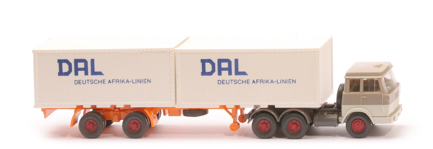 | Zugmaschine | Kabine oben | graubeige | Kabine unten | altweiß | Verglasung | klar | Inneneinrichtung | ca. graubeige | Lenkrad | mit | Chassis | basaltgrau | Radlauf hinten | basaltgrau, 2-teilig | Sattelpfanne | für großen Königsbolzen | Reserverad | hinter Kabine | Räder | Profil grob | Felgen | hellbraunrot | | Container | Art | 2 x 20 ft neu | Farbe | weiß | Türen | alt | Beschriftung | DAL OHNE Nummer (s. Foto) | Beschriftung Art | Druck ca. stahlblau | | Auflieger | Farbe | gelborange | Unterfahrschutz | ohne | Königsbolzen | stark | Räder | Profil grob | Felgen | hellbraunrot |