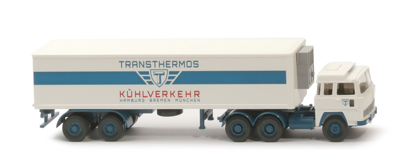 | Zugmaschine | Kabine oben | weiß | Kabine unten | weiß | Verglasung | klar | Inneneinrichtung | ca. basaltgrau, Lkr integriert | Grill | ca. azurblau, silbern bedruckt | Bedruckung der Kabine | umfänglich (s. Foto) | Chassis | Typ 3, ca. azurblau | Bodenprägung | WM | Radlauf hinten | 2-teilig, azurblau | Sattelpfanne | für großen Königsbolzen | Reserverad | ohne | | Auflieger | Kofferdach | weiß | Koffer Korpus | weiß | Türen | weiß | Kühlaggregat | ca. silbergrau | Chassis Typ | skelletiert - für Steckbauweise, aber geklebt | Chassis Farbe | ca. azurblau | Bodenprägung | neues WIKING-Logo | Doppelachsaggregat Farbe | ca. azurblau | Stützen | ca. azurblau | Beschriftung | Transthermos ... (s. Bild) | | Räder | Räder Typ | 12 mm, Felgen eingesetzt | Felgen | 8-Loch, ca. azurblau |