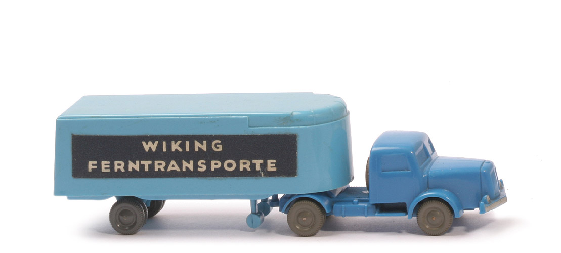 Achsen | Rollachser | | Zugmaschine | Farbe Kabine | himmelblau | Farbe Chassis | himmelblau | Bemalung | Scheinwerfer, Stoßstange | Sattelpfanne | eingesetzt, in Chassisfarbe | Chassis | Version 1a | Achshalterungen | geschlossen | Bodenprägung | WM (ohne Kreis) | Reserverad | hinter Kabine | Räder | Profil | | Auflieger | Farbe Oberteil | adriablau | Farbe Unterteil | adriablau | Radlauf | ohne Kotflügel | Bodenprägung | WM im Kreis | Rückleuchten | ohne | Dach | glänzend | Aufkleberart | Papier, matt | Beschriftung | Ferntransporte (s. Foto) | Beschriftung Farbe | blau mit weißer Schrift | Räder | Profil |
