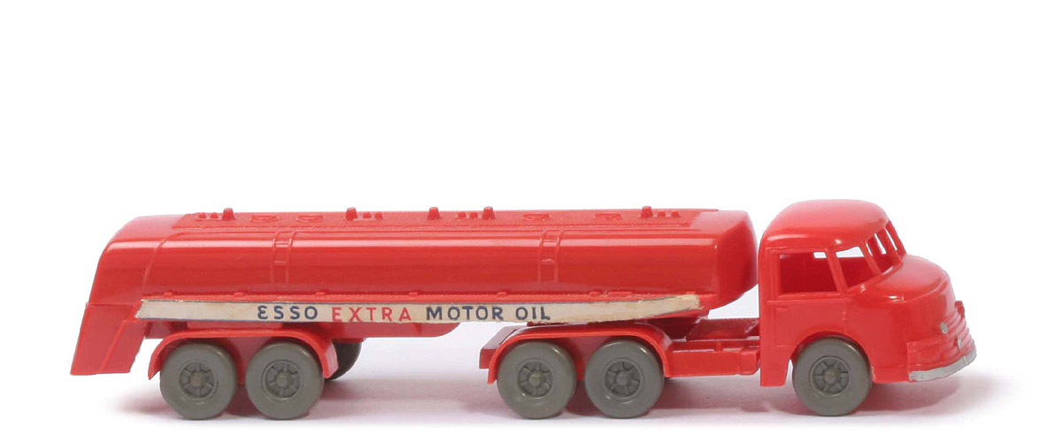 | Zugmaschine | Verglasung | ohne | Kabine Farbe | orangerot | Chassis Farbe | orangerot | Kabinenrückwand | ohne Haltenasen | Bemalung | Scheinwerfer, Stoßstange | Bodenprägung Chassis | WM ohne Kreis | vordere Auswerfermarkierung | 3 mm | hintere Auswerfermarkierung | 4 Stück | Achshalterungen | geschlossen | Sattelpfanne | integriert | Reserverad | ohne | Rückleuchten | ohne | Räder vorn | Version 7 - betongrau | Räder hinten | Version 7 - betongrau | | Auflieger | Farbe Korpus, Unterteil | orangerot | Farbe Achseinheit | orangerot | Königsbolzen | dünn, integriert | Bodenprägung Unterseite | WM im Kreis | Bodenprägung Achseinheit | ohne | Typ Achshalterung | gerade, geschlossen | Reserverad | ohne | Rückleuchten | ohne | Beschriftung Seite | Papieraufkleber | Länge / Art | 46mm / EXTRA in rot | Beschriftung Heck | Papieraufkleber | Rand | schmal | Bemalung Nummernschild | silber | Räder | Version 7 - betongrau |