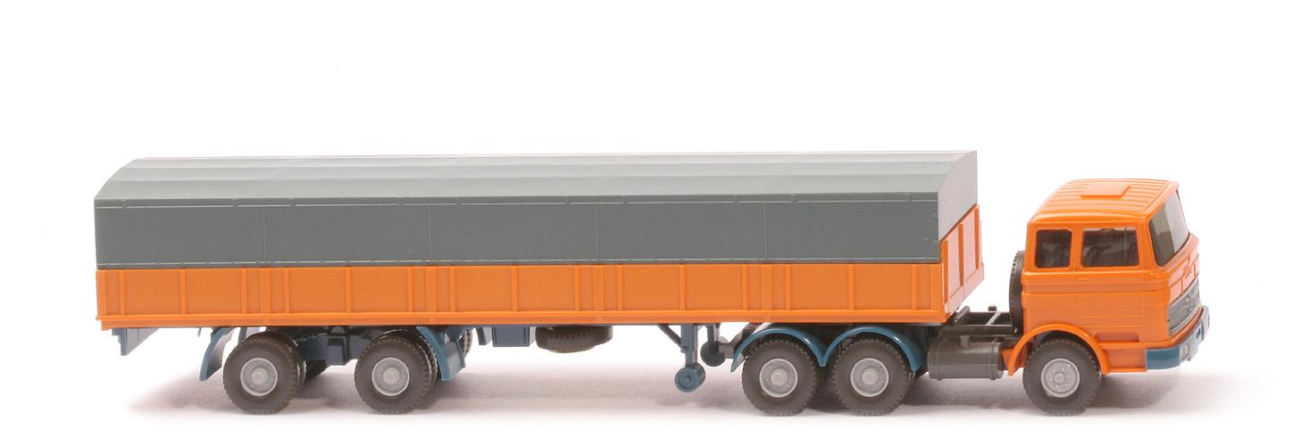 | | Zugmaschine | | Typ | Dach längsversteift | | Kabine | gelborange | | Spiegel | ohne | | Scheibenwischer | ohne | | Verglasung | getönt | | Lenkrad | ohne | | Inneneinrichtung | ca. hellgelbgrau | | Stoßstange | azurblau, Scheinwerfer gesilbert | | Chassis | basaltgrau | | Zentriernippel für Pritsche | ohne | | Radlauf hinten | zweiteilig azurblau | | Reserverad | hinter Kabine | | Sattelpfanne | für großen KöBo | | Räder | Profil grob | | Felgen | silbergrau | | | Auflieger | | Pritsche Farbe | gelborange | | Chassis Farbe | azurblau | | Pritscheneinlage | Pappe, silbern | | Plane Farbe | blaugrau | | Reserverad | unter Auflieger, gesteckt | | Unterfahrschutz | ohne | | Königsbolzen | stark | | Räder | Profil grob | | Felgen | silbergrau |