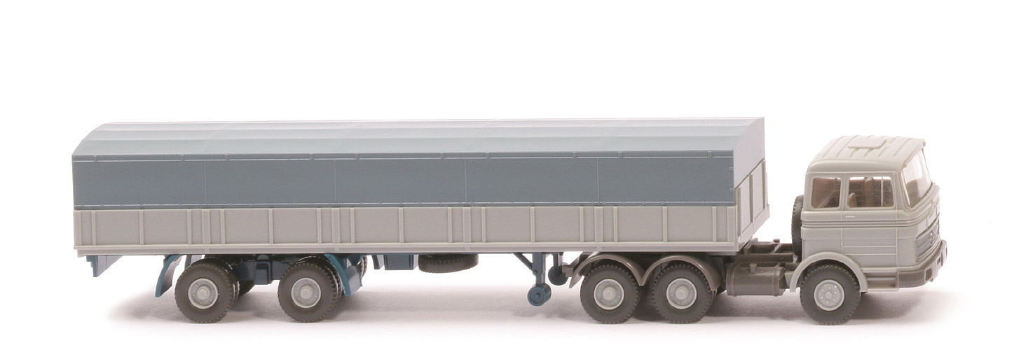 | | Zugmaschine | | Typ | Dach querversteift | | Kabine | silbergrau | | Spiegel | ohne | | Scheibenwischer | ohne | | Verglasung | klar | | Lenkrad | ohne | | Inneneinrichtung | ca. hellgelbgrau | | Stoßstange | basaltgrau, Scheinwerfer ungesilbert | | Chassis | basaltgrau | | Zentriernippel für Pritsche | mit | | Radlauf hinten | zweiteilig basaltgrau | | Reserverad | mit | | Sattelpfanne | für großen KöBo | | Räder | Profil grob | | Felgen | silbergrau | | | Auflieger | | Pritsche Farbe | silbergrau | | Chassis Farbe | ozeanblau | | Pritscheneinlage | Pappe, silbern | | Plane Farbe | graublau | | Reserverad | unter Auflieger, gesteckt | | Unterfahrschutz | ohne | | Königsbolzen | stark | | Räder | Profil grob | | Felgen | silbergrau |