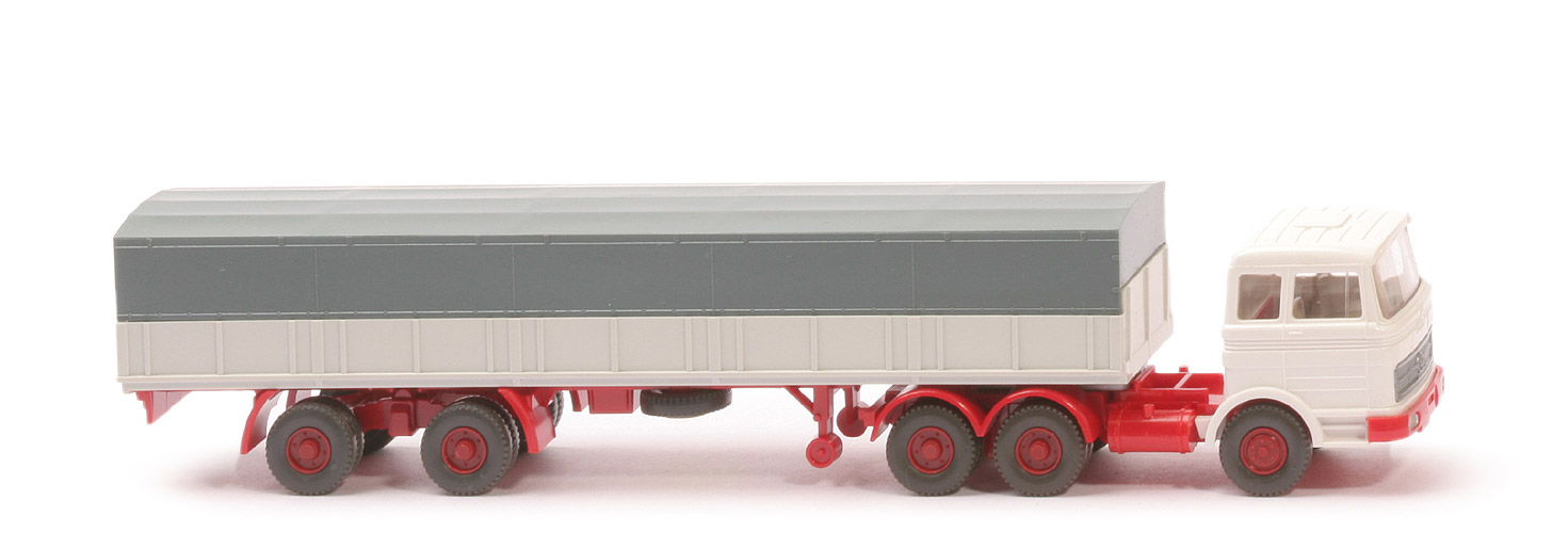 | | Zugmaschine | | Typ | Dach querversteift | | Kabine | weiß | | Spiegel | ohne | | Scheibenwischer | ohne | | Verglasung | klar | | Lenkrad | ohne | | Inneneinrichtung | ca. hellgelbgrau | | Stoßstange | rot, Scheinwerfer gesilbert | | Chassis | rot | | Zentriernippel für Lastpritsche | ohne | | Radlauf hinten | einteilig rot | | Reserverad | ohne | | Sattelpfanne | für großen KöBo | | Räder | Profil grob | | Felgen | hellbraunrot | | | Auflieger | | Pritsche Farbe | altweiß | | Chassis Farbe | rot | | Pritscheneinlage | Pappe, silbern | | Plane Farbe | blaugrau | | Reserverad | unter Auflieger, gesteckt | | Unterfahrschutz | ohne | | Königsbolzen | stark | | Räder | Profil grob | | Felgen | hellbraunrot |
