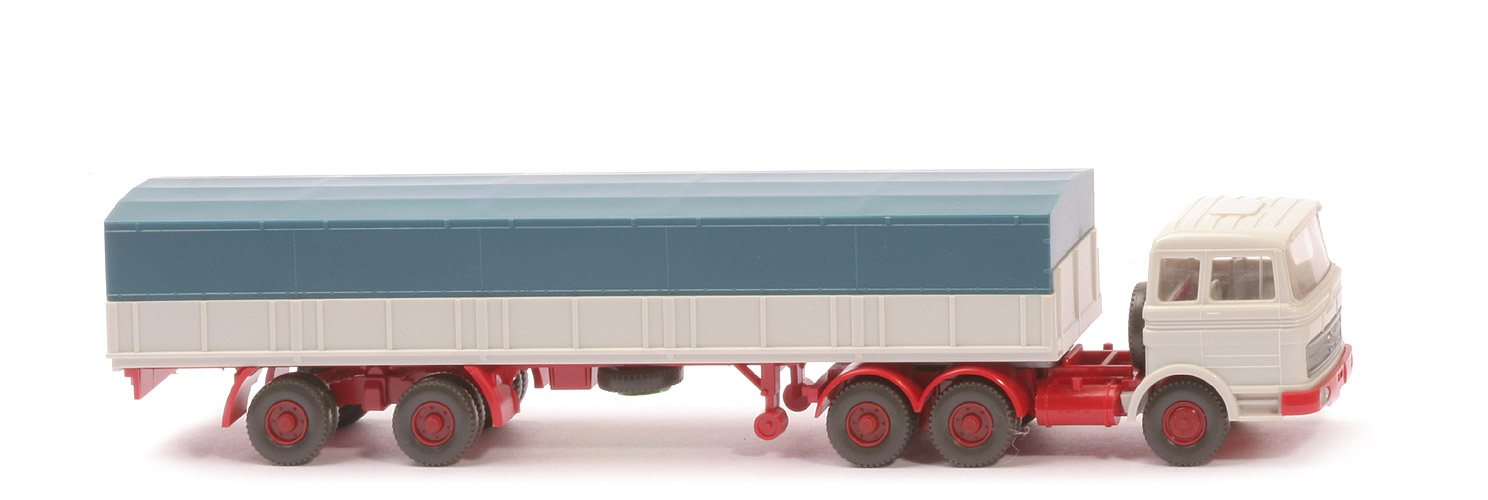 | Zugmaschine | Typ | Dach querversteift | Kabine | altweiß | Spiegel | ohne | Scheibenwischer | ohne | Verglasung | klar | Lenkrad | ohne | Inneneinrichtung | ca. lichtgrau | Stoßstange | rot, Scheinwerfer gesilbert | Chassis | rot | Zentriernippel für Pritsche | ohne | Radlauf hinten | zweiteilig rot | Reserverad | hinter Kabine | Sattelpfanne | für großen KöBo | Räder | Profil grob | Felgen | hellbraunrot | | Auflieger | Pritsche Farbe | altweiß | Chassis Farbe | rot | Pritscheneinlage | Pappe, silbern | Plane Farbe | azurblau | Reserverad | unter Auflieger, gesteckt | Unterfahrschutz | ohne | Königsbolzen | stark | Räder | Profil grob | Felgen | hellbraunrot |