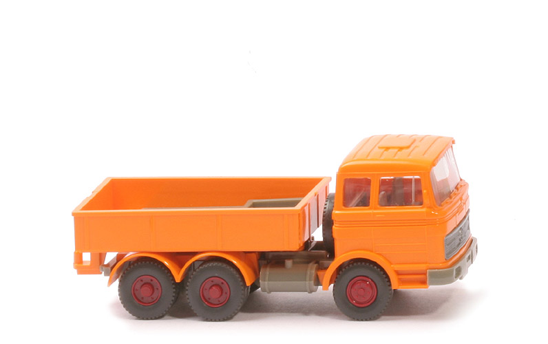 | Zugmaschine | Typ | Dach querversteift | Kabine | orangegelb | Spiegel | mit | Scheibenwischer | mit | Verglasung | klar | Inneneinrichtung | ca. hellgraubeige, mit Lenkrad | Stoßstange | zementgrau | Chassis | zementgrau | Halterung Pritsche | mit | Radlauf hinten | zweiteilig orangegelb | Reserverad | hinter Kabine | Sattelpfanne | für großen KöBo | Pritsche Fixierung | gesteckt | Pritsche Farbe | orangegelb | Zughaken | in Pritsche integriert | Pritscheneinlage Typ | Kunststoff, mit Unterteilung | Pritscheneinlage Farbe | zementgrau | Räder | Profil grob | Felgen | hellbraunrot - 6-Loch |