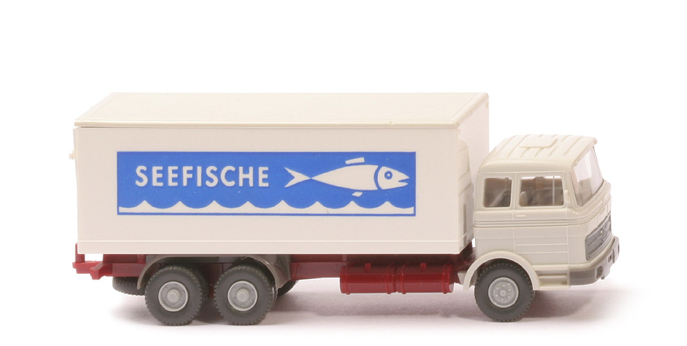 Kabine Typ | Dach querversteift | Kabine Farbe | grauweiß | Spiegel | mit | Scheibenwischer | ohne | Verglasung | klar | Lenkrad | mit | Inneneinrichtung | ca. hellgelbgrau | Grill | silbern eingesetzt | Stoßstange | basaltgrau | Chassis | weinrot | Zughaken | mit | Bemalung | ohne | Radlauf hinten | einteilig, basaltgrau | Reserverad | hinten unter Chassis | Kofferkorpus | weiß | Kofferdach | grauweiß | Ladebordwand | weiß | Beschriftung | Seefische ... (s. Foto) | Beschriftung Art | Negativdruck blau | Räder | Profil grob | Felgen | silbergrau |