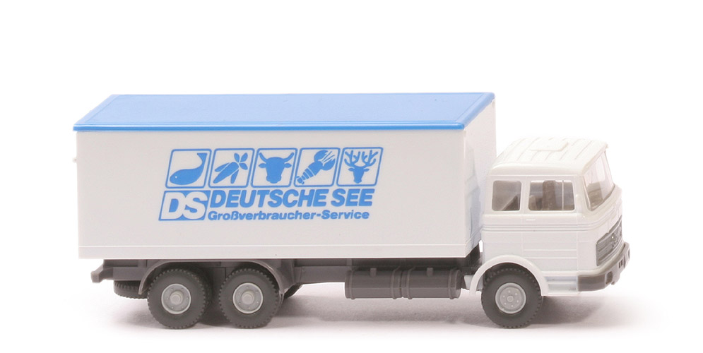 Kabine Typ | Dach querversteift | Kabine Farbe | weiß | Spiegel | mit | Scheibenwischer | ohne | Verglasung | klar | Lenkrad | mit | Inneneinrichtung | ca. graubeige | Grill | silbern eingesetzt | Stoßstange | basaltgrau | Chassis | basaltgrau | Zughaken | ohne | Bemalung | ohne | Radlauf hinten | einteilig, basaltgrau | Reserverad | hinten unter Chassis | Kofferkorpus | weiß | Kofferdach | signalblau | Ladebordwand | weiß | Beschriftung | Deutsche See ... (s. Foto) | Beschriftung Art | Druck signalblau | Räder | Profil grob | Felgen | silbergrau |