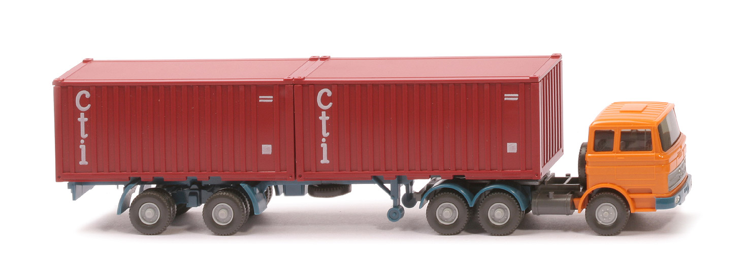 | | Zugmaschine | | Typ | Dach längsversteift | | Kabine | orangegelb | | Spiegel | ohne | | Lenkrad | ohne | | Scheibenwischer | ohne | | Inneneinrichtung | ca. lichtgrau | | Stoßstange | azurblau, Scheinwerfer gesilbert | | Chassis | basaltgrau, ohne Zentriernippel | | Radlauf hinten | zweiteilig azurblau | | Reserverad | hinter Kabine | | Räder | Profil grob | | Felgen | silbergrau | | | Container | | Art | 2 x 20 ft Stahlcontainer mit Aussparung | | Farbe | rubinrot | | Türen | für Stahlcontainer | | Beschriftung | cti (s. Foto) | | Beschriftung Art | Druck weiß | | | Auflieger | | Farbe | azurblau | | Unterfahrschutz | ohne | | Königsbolzen | stark | | Räder | Profil grob | | Felgen | silbergrau |