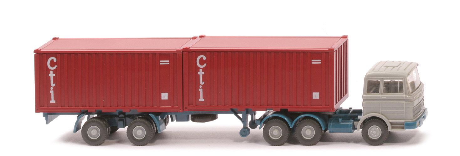 | | Zugmaschine | | Typ | Dach querversteift | | Kabine | silbergrau | | Spiegel | ohne | | Lenkrad | ohne | | Scheibenwischer | ohne | | Inneneinrichtung | ca. hellgelbgrau | | Stoßstange | azurblau, Scheinwerfer gesilbert | | Chassis | azurblau, mit Zentriernippel | | Radlauf hinten | zweiteilig azurblau | | Reserverad | ohne | | Räder | Profil grob | | Felgen | silbergrau | | | Container | | Art | 2 x 20 ft Stahlcontainer mit Aussparung | | Farbe | rubinrot | | Türen | für Stahlcontainer | | Beschriftung | cti (s. Foto) | | Beschriftung Art | Druck weiß | | | Auflieger | | Farbe | azurblau | | Unterfahrschutz | ohne | | Königsbolzen | stark | | Räder | Profil grob | | Felgen | silbergrau |