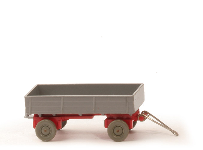 | Pritsche | Pritsche Farbe | staubgrau | Pritschenseiten | mit Struktur | Pritscheneinlage | ohne | Kennzeichen hinten | einteilig | | Chassis | Chassis Variante | wie Typ 4, jedoch angeklebter Zughaken | Chassis Farbe | rot | Achshalterungen | offen | Drehschemel | eingesteckt | Bodenprägung Drehschemel | ohne | Bodenprägung Chassis | Germany | Zughaken | ins Chassis integriert | | weitere Details | Deichsel | Draht | Bemalung Rückleuchten | ohne | Bemalung Kennzeichen | ohne | Räder | 10 mm, neuere Ausführung |