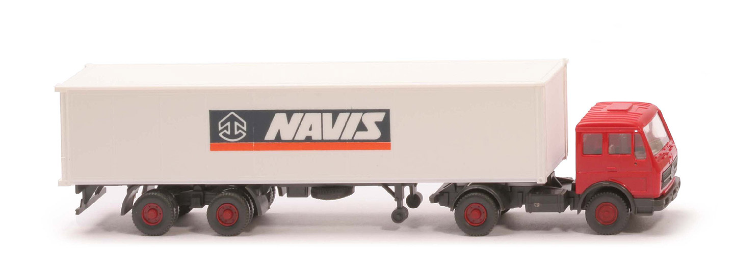| Zugmaschine | Kabine | rot | eingesetzter Grill | schwarz, mit Streifen | Lüfter | hoch | Heckfenster | offen | Spiegelaufnahmen | mit | Inneneinrichtung | ca. hellolivgrau | Stoßstange | anthrazit | Chassis | anthrazit | Radlauf hinten | anthrazit | Reserverad | ohne | Räder | Profil grob | Felgen | hellbraunrot | | Container | Art | 1 x 40 ft neu | Farbe | weiß | Türen | neu | Beschriftung | Navis (klein, s. Foto) | Beschriftung Art | Druck stahlblau - orange | | Auflieger | Farbe | anthrazit | Unterfahrschutz | mit | Königsbolzen | stark | Räder | Profil grob | Felgen | hellbraunrot |